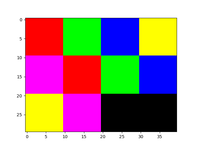 plt.imshow(patchwork(colors + colors, side=10, background=[0, 0, 0]))on obtiendrait cette fois (observez la taille en pixels de l’image)