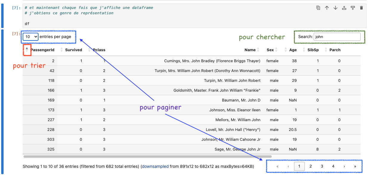 df = pd.read_csv('data/titanic.csv')et maintenant chaque fois que j’affiche une dataframe j’obtiens ce genre de représentation